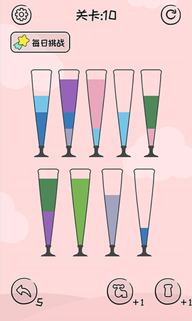 1、操作简单到单手就能玩,点击瓶口自动倾倒,但要注意只有颜色相同且目标瓶有空位时才能触发"沙瀑"特效