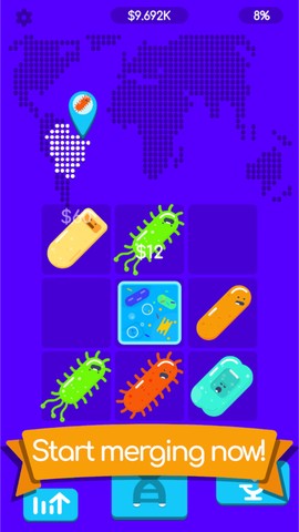 2. 轻松拖曳合成,没有繁琐的操作,一步步解锁更高等级的细菌,目标是征服全球!