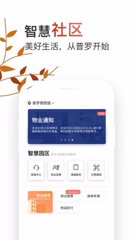 2、首页上的物业通知、智慧园区和物业服务一览无遗,尽情探究!